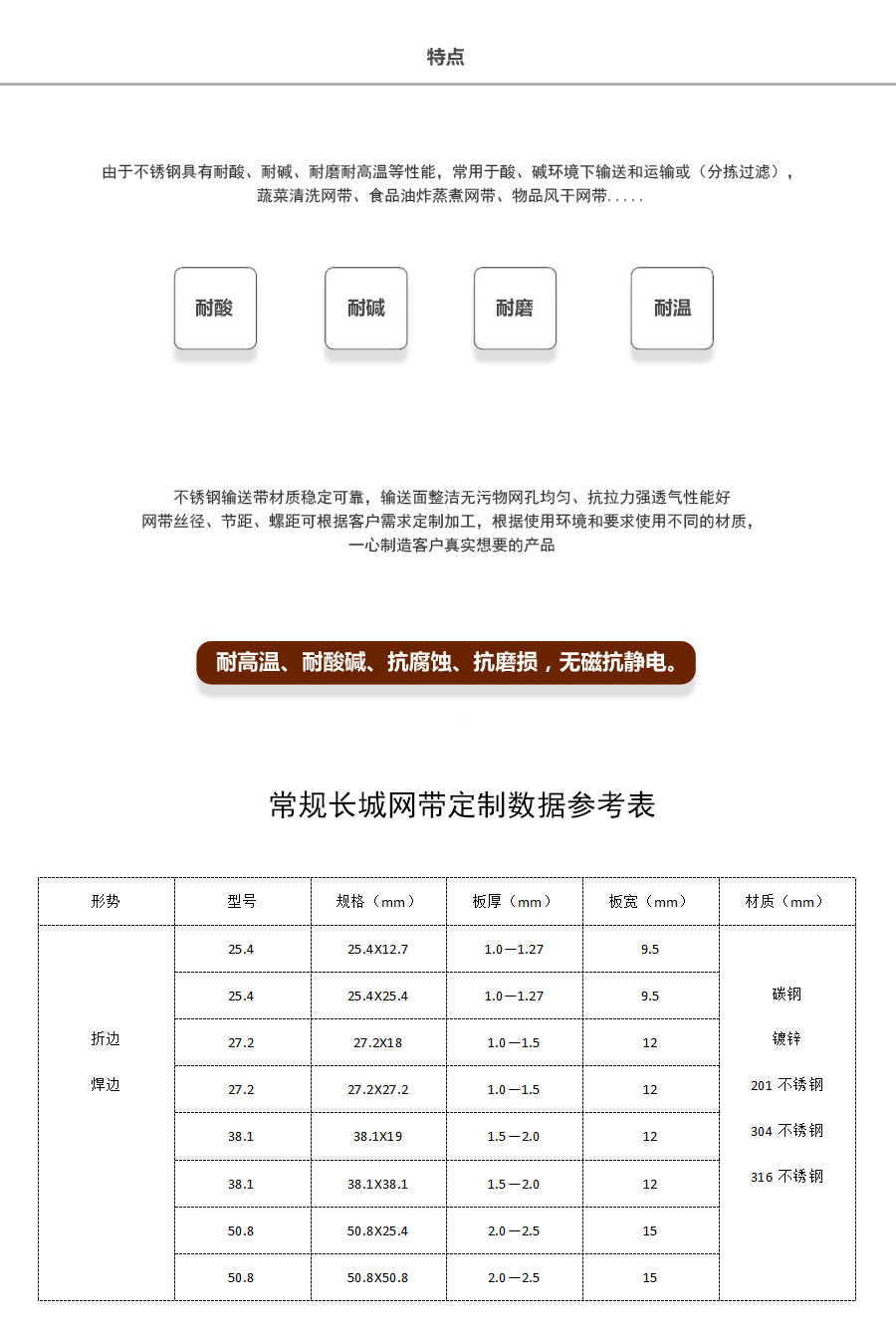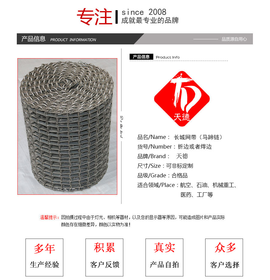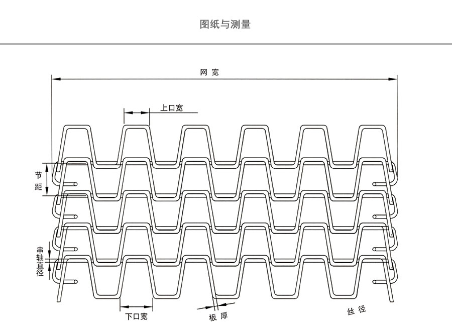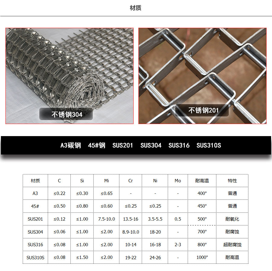 長城網帶材質:有A3低碳鋼、45#鋼、1Cr13耐熱鋼、 不銹鋼、304不銹鋼、1Cr18Ni9Ti不銹鋼、0Cr18Ni14NO2CU2耐熱耐酸鋼等